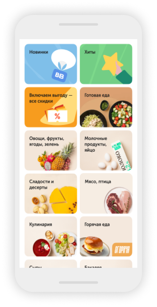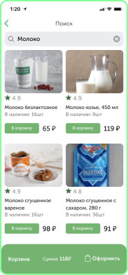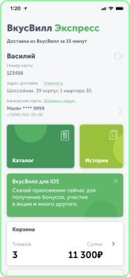 Указав адрес доставки, пользователь увидит ассортимент товаров в ближайших магазинах. С помощью поиска он находит необходимые продукты в каталоге, добавляет их в корзину. Закреплённый за пользователем QR-код даёт возможность накапливать баллы.