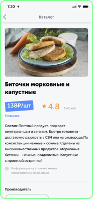 Каталог отражает все товары сети. Есть возможность искать товар по названию с помощью поиска, либо по штрихкоду. В карточке можно посмотреть наличие товара в магазинах, узнать рейтинг на основе оценок покупателей.