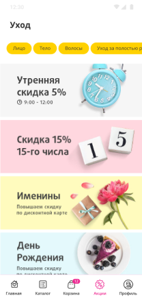 Пользователи могут совершать онлайн предзаказы и отслеживать свой прогресс в программе лояльности, всегда быть в курсе акционных предложений, новостей сети и предложений по новинкам, благодаря онлайн обновлению каталога.